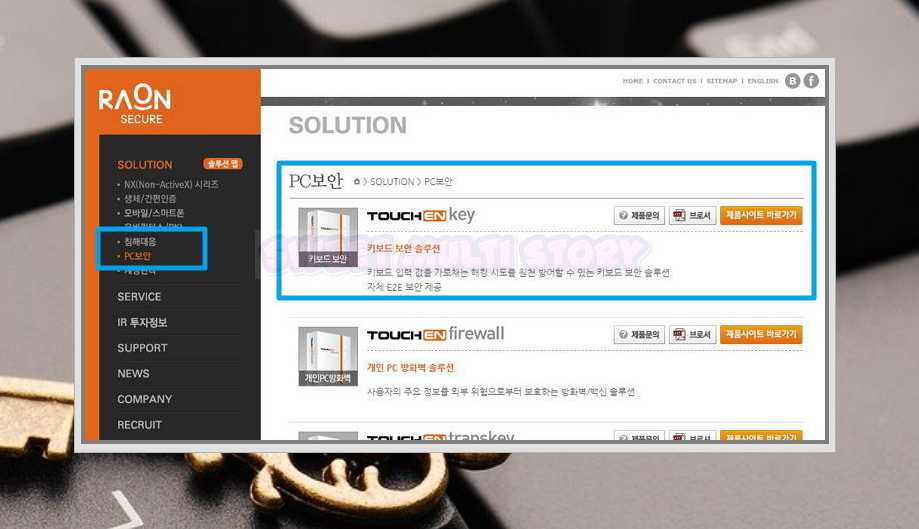 ▲ 솔루션에서 PC보안으로 들어가보면 키보드 보안 프로그램에 대한 소개와 브로셔, 제품문의, 제품 관련 사이트가 나타납니다.