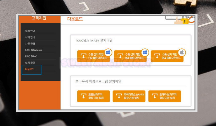 ▲ 다양한 버전의 키보드 보안 프로그램 설치 파일을 내려 받거나 안내를 받을 수 있는 사이트의 주소입니다. 익스플로러, 크롬, 파이어폭스 등 어떤 브라우저를 사용하던 키보드를 안전하게 사용할 수 있습니다.
