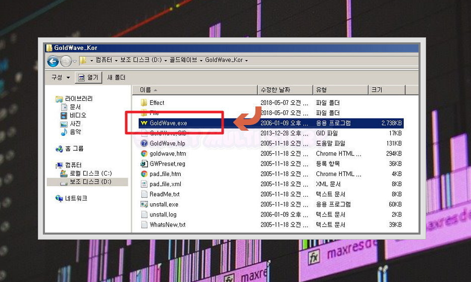 2. 다운 받은 압축 파일을 풀면 골드웨이브 실행 파일을 찾을 수 있습니다.