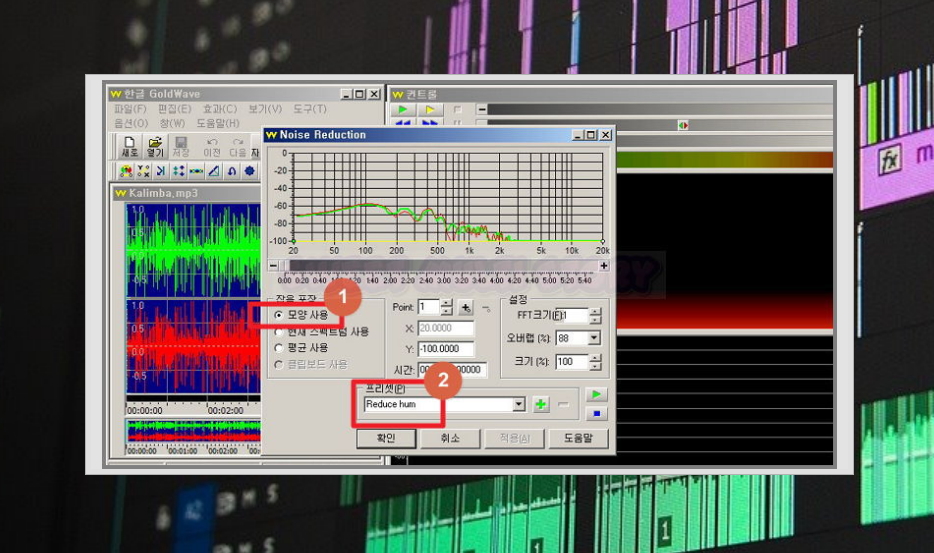 잡음 포장을 모양 사용으로 변경한 후 프리셋에서 'reduce hum'을 선택하는 방법을 추천합니다.