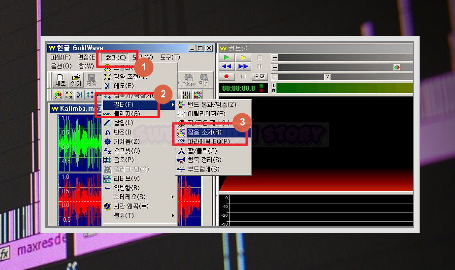 4. 골드웨이브의 메뉴에서 '효과'를 클릭한 후 필터 및 잡음 소거를 클릭합니다.