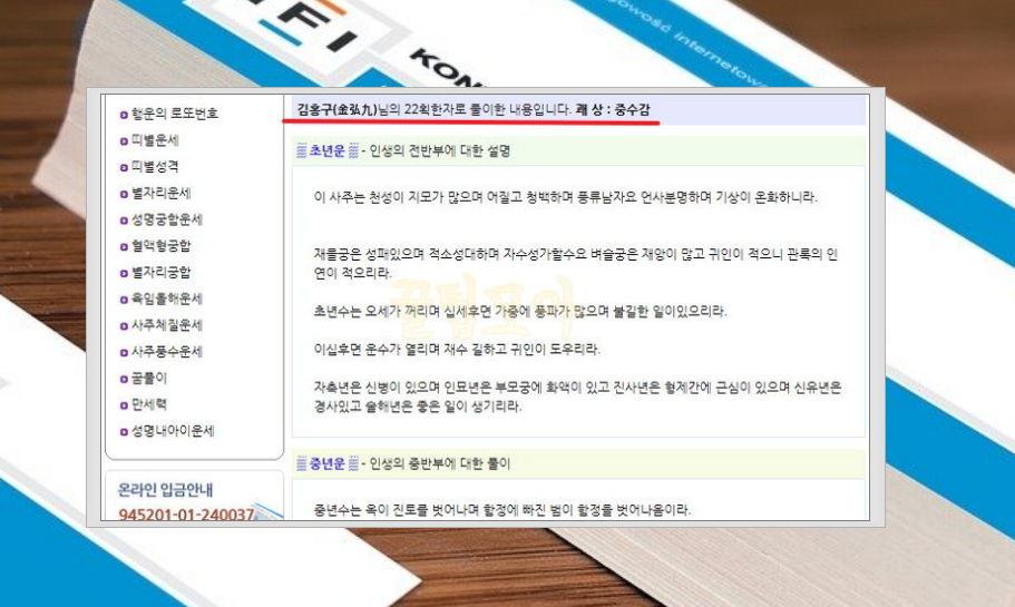 4) 사이트에서 회원가입을 하거나 로그인을 하지 않아도 결과를 무료로 확인할 수 있습니다. 풀이는 초년운, 중년운, 말년운 이렇게 3가지로 구성이 되는데요. 어떤 일이 생기고, 본인에게 무엇이 부족하거나 많은지 알려줍니다.