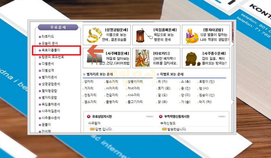2) 사이트 왼쪽에 있는 무료운세 메뉴를 보시면 타로카드, 오늘의 운세 등이 나타나는데요. 육효 이름풀이를 선택해 주세요.
