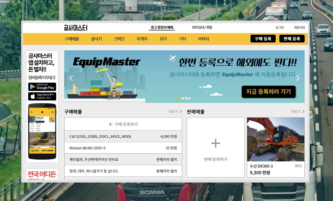 ▲ 마지막으로 최근에 나타난 공사마스터 입니다. 상당량의 중고 중장비 매매 매물을 많이 가지고 있는 곳으로 알려져 있는데요. 홈페이지가 깔끔해서 매물 찾기에 좋습니다. 전용 앱도 만들은 것 같은데 관심 있는 분은 설치보세요.