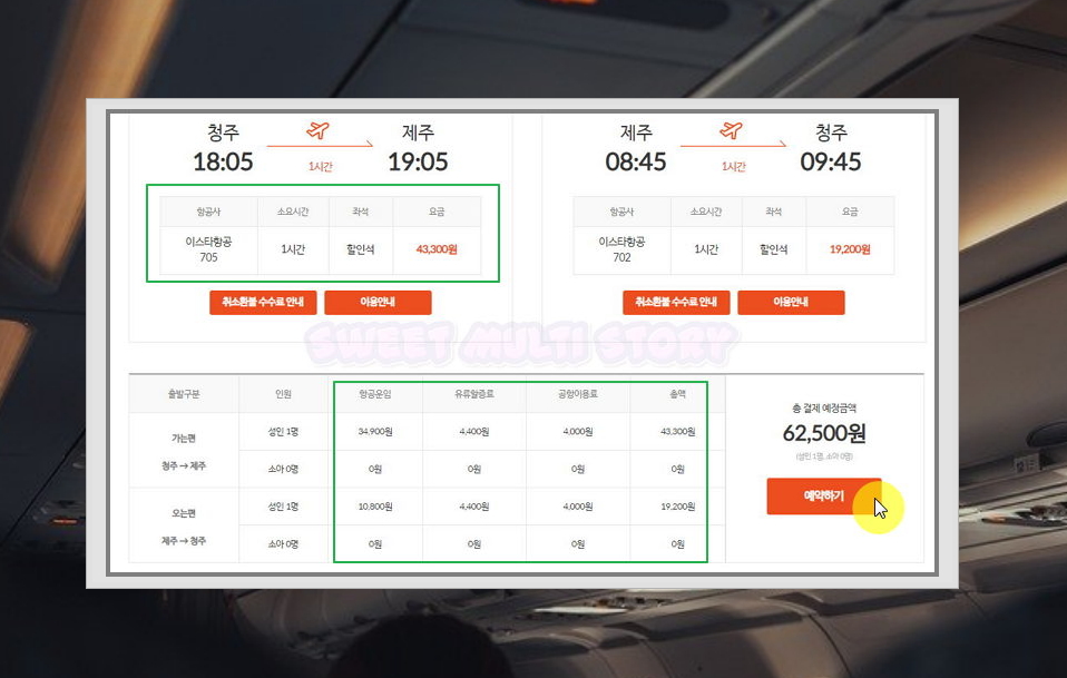 6. 예매사이트를 선택하면 예약을 할 수 있는 페이지로 이동하게 되는데요. 청주에서 제주로 몇 시에 출발해서 몇 시에 도착하는지 그리고 항공운임, 공항이용료, 유류할증료는 얼마나 되는지 꼼꼼히 확인해 보세요.