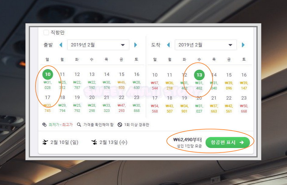 3. [항공권 검색] 버튼을 누르면 날짜별 비행기표 최저가를 알 수 있어요. 2019년 2월에는 청주에서 출발하는 티켓의 가격이 3만원 정도이고, 제주에서 돌아올 때도 3만원 정도네요. 보통 금요일에 가고, 일요일에 돌아오는 사람이 많기 때문에 금요일 출발 및 일요일 도착하는 티켓이 가장 비싸요.