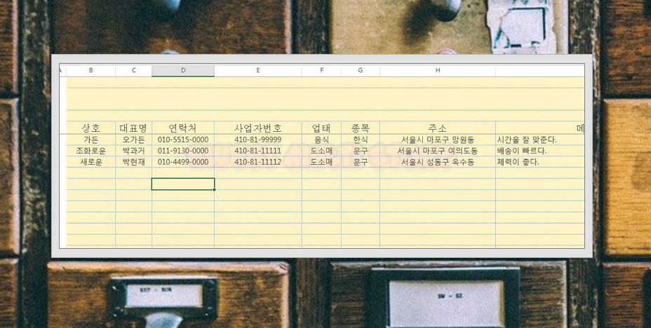 4. 사업체를 운영하면서 거래처에 대한 정보도 관리할 필요가 있는데요. 제가 첨부한 재고관리 엑셀프로그램에서는 거래처 등록 및 리스트 확인이 가능해요. 메모를 통해 각 거래처의 특성과 대응 방식을 적어 놓아 보세요. 사업을 할 때 알게 모르게 도움이 될 거에요.