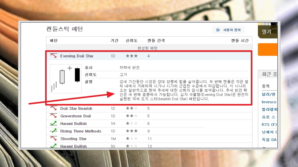 10. 기술 분석 서비스에서 캔디스틱 패턴이 있습니다. 그래프의 그려진 핸들에 모양을 가지고 미래를 예측하는 것이죠. 무조건 맞는 것은 아니지만, 어느 정도 신뢰가 되는 도구입니다.