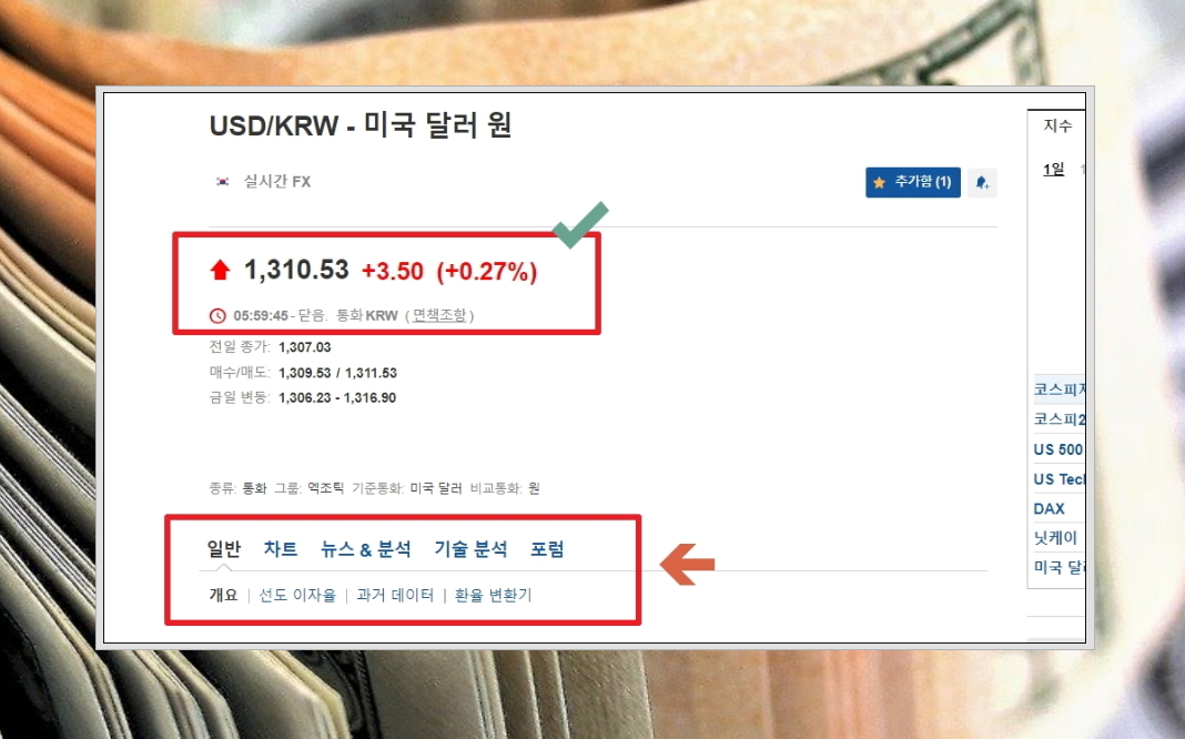 신속하게 실시간으로 달러시세를 확인하고, 미래의 환율에 대한 전망을 해보는 방법을 알려드립니다. 환율이 상승하면서 외환 투자에 관심이 있는 분들이 많으실 거예요. 하지만 환율은 변동이 심하고 예측하기 어렵습니다. 그래서 오늘의 시세 정도는 기본으로 확인하고, 여러 가지 분석과 도구를 이용하여 미래 환율 전망을 해보는 것이 좋습니다. 이 방법은 그리 어렵지 않아요. 순서대로 따라하면 돼요.