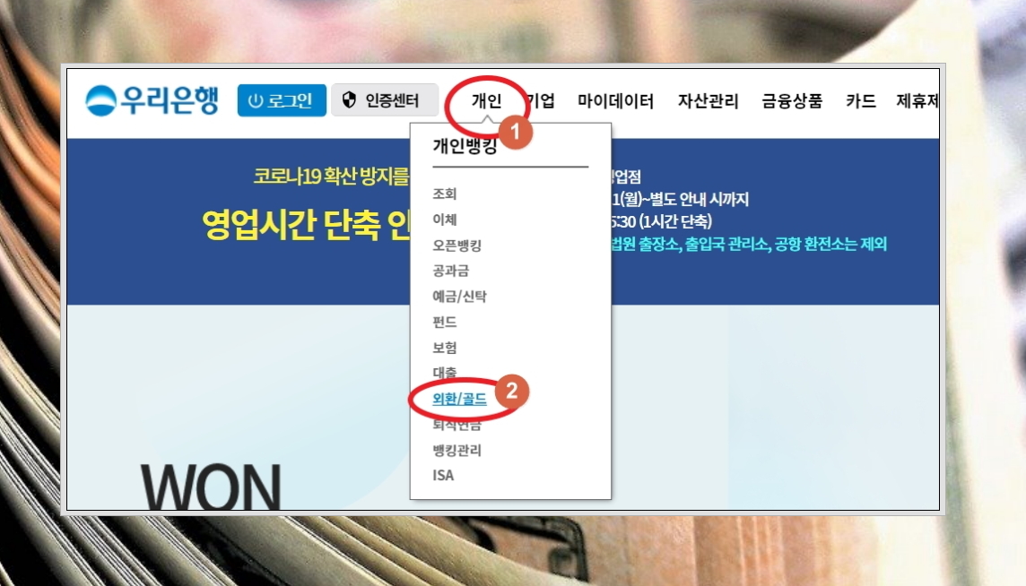 3. 조회를 하기 위해서는 사이트에 접속해서 메뉴에 있는 [개인]과 [외환 및 골드]를 선택하면 됩니다.