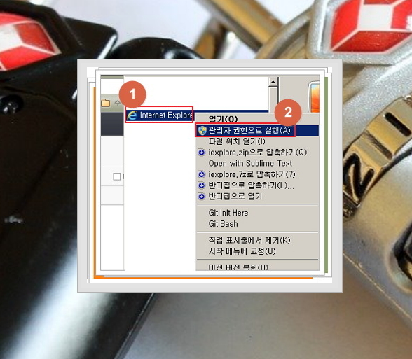 ▲ 위와 같이 다하셨으면 [시작] 버튼 눌러서 익스플로러를 찾으신 후에 오른쪽 버튼 눌러주세요.