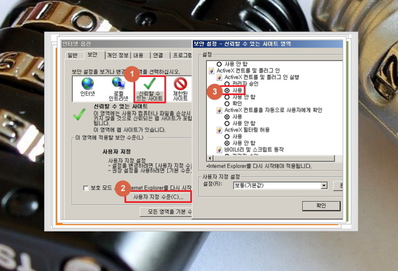 ▲ 1번에 있는 [신뢰할 수 있는 사이트]를 누른후 [사용자 지정 수준]을 클릭하시면 창이 하나 뜨는데요.