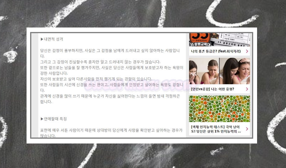 과거에는 신문에서 심리 테스트를 풀어보곤 했습니다. 재미는 있지만, 하루에 1가지이기 때문에 부족한 느낌이 있었는데요. 이제는 인터넷을 통해 만나보세요. 총집합이라고 할만큼 많은 양을 무료로 이용할 수 있기 때문에 심심할 겨를이 없습니다. 성격, 사랑, 연애, 혈액형 등 다양한 면에서 알아볼 수 있어요.