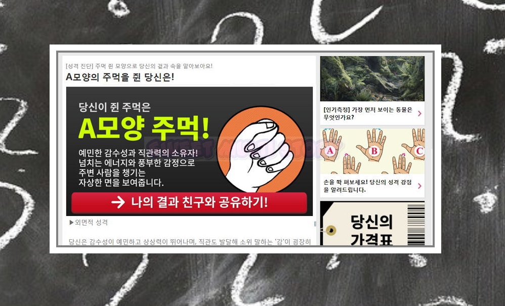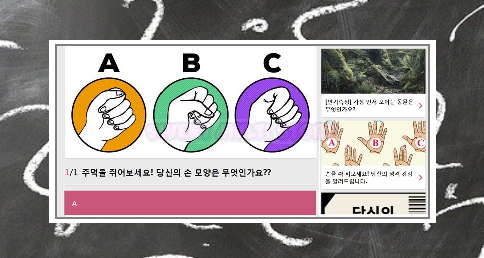 주먹에 대한 것 외에도 도형, 혈액형, 그림 등을 통해 심리와 성격을 알아볼 수 있는 퀴즈가 많습니다.