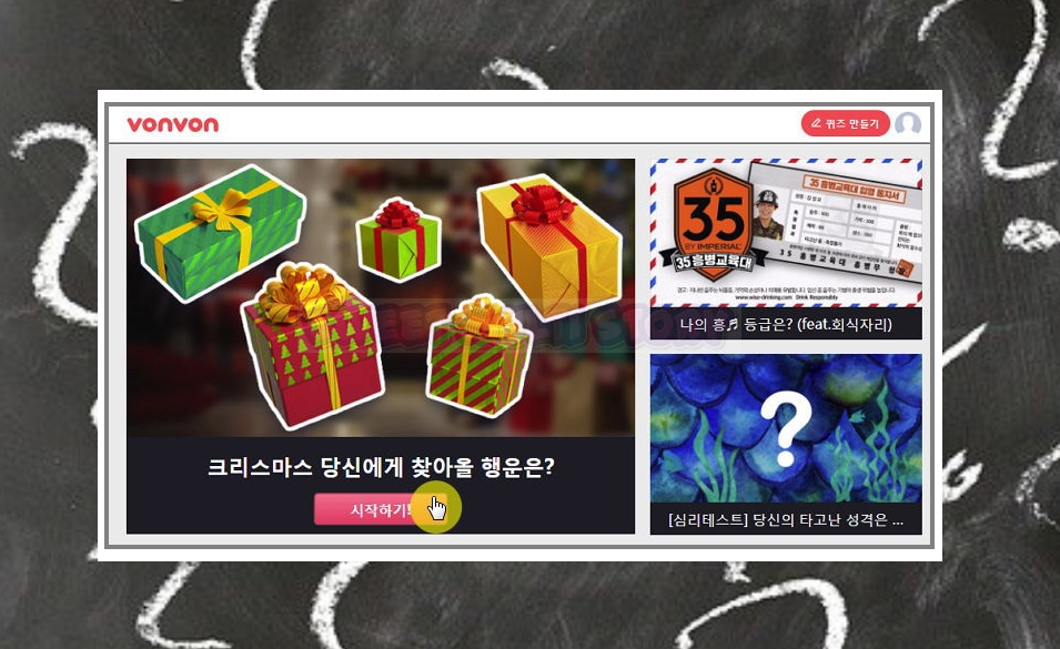 홈페이지에 접속하면 다양한 성격 심리 테스트가 나타나는데요. 좀 있으면 크리스마스죠? 이와 관련된 테스트를 통해 이용법을 알려드리겠습니다. 시작하기 버튼을 눌러주세요.