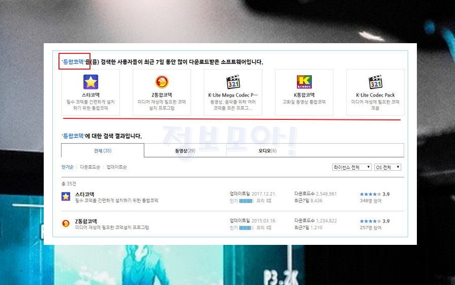 전용 코덱을 찾기 위하여 어떤 동영상이 안 나오는지 확인할 필요는 없습니다. 통합코덱 하나면 어떤 동영상이든 안 나올때 해결하실 수 있어요. 스타코덱, Z통합코덱 등 대부분이 무료로 이용할 수 있는 프리웨어이고, 한 번만 실행하면 자동으로 설치가 되기 때문에 이용이 수월합니다.