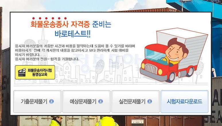 화물트럭에 관련된 다양한 서비스를 제공하는 드라이버스 홈페이지가 있습니다. 이곳에서는 자격시험 관련 자료를 제공하고 있는데요. 링크를 통해 쉽게 접속하실 수 있습니다.