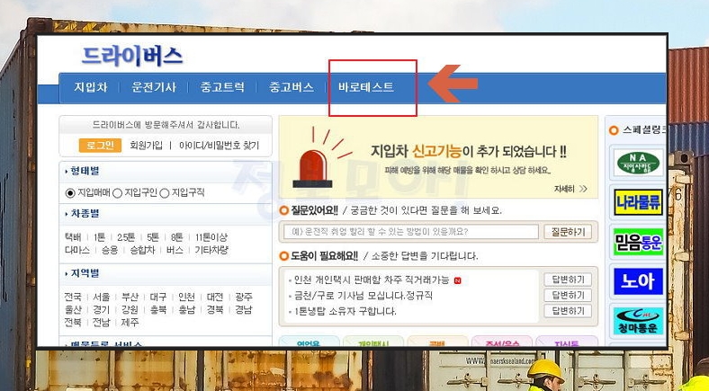 메뉴에 보시면 지입차, 운전기사, 중고트럭 등이 나오는데요. 맨 오른쪽에 있는 바로테스트를 클릭해주세요.
