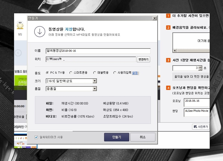 9. 동영상의 이름, 저장할 위치, 용도, 크기, 품질을 선택한 후에 만들기 버튼을 클릭하면 제작이 완료됩니다.