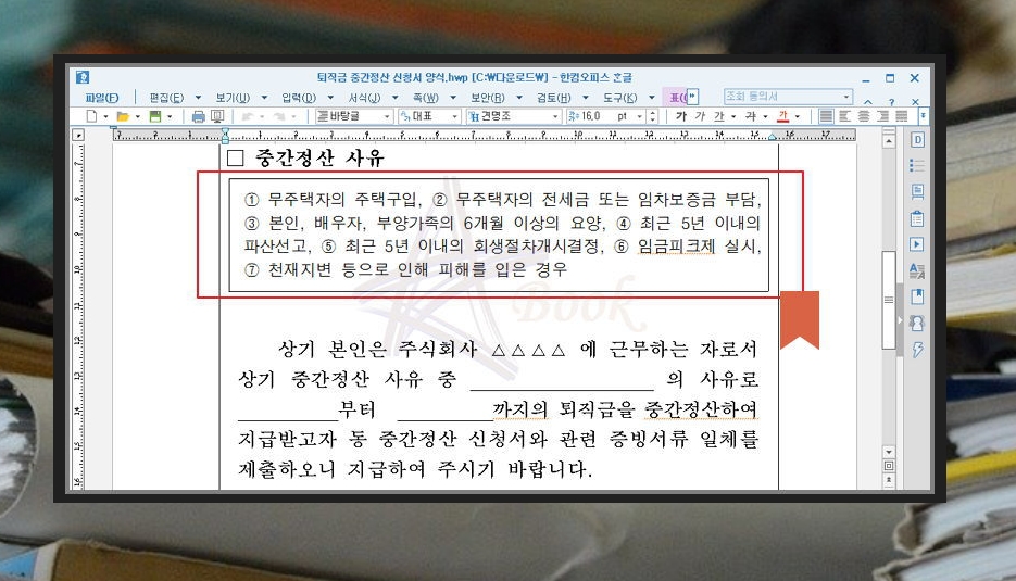 양식에 나와있듯이 일부 요건을 충족해야 퇴직금을 중간정산 받으실 수 있습니다. 물론 고용주가 승낙해야지 지급이 가능한데요. 자금 문제가 없다면 대부분 신청을 받아준답니다. 나중에 지급할 퇴직금을 앞당겨 정산하는 것이기 때문에 회사 입장에서도 퇴직금을 중간에 지급하는 것이 나쁘지 않습니다.