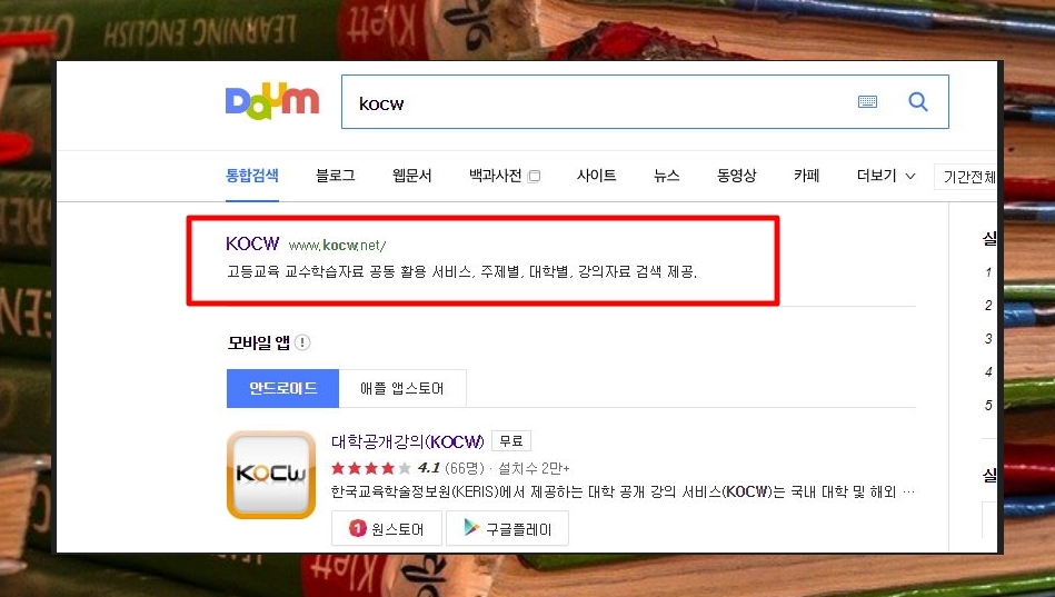 대학공개강의(KOCW) 서비스는 스마트폰으로도 이용할 수 있사오니 안드로이드 스마트폰은 구글플레이에서 아이폰은 애플 앱스토어에서 앱을 다운 받아 설치하시면 됩니다.