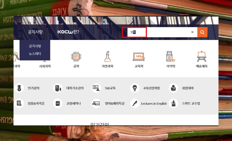 kocw 사이트에 접속하면 검색창과 함께 메뉴가 나타나는데요.