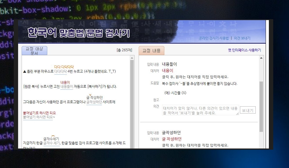 검색 사이트에서 한국어 맞춤법을 검색해 보세요. 그럼 부산대학교 인공지능 연구실과 나라인포테크에서 만든 프로그램을 만나볼 수 있어요. 사이트에 접속해보면 아시겠지만, 누구나 무료로 이용할 수 있어요. 회원 가입도 필요 없고요.