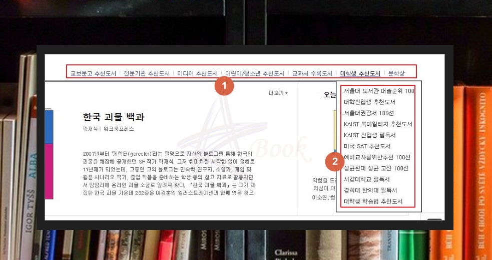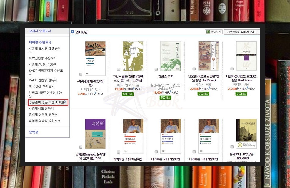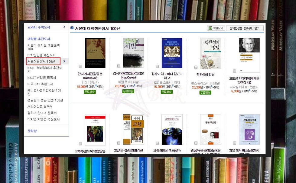 단순히 도서 100권만 추천하는 것이 아니에요. 다양한 테마로 읽어야 하는 책을 찾을 수 있어요. 메뉴에 있는 [대학생 추천도서]를 클릭하면 [서울대 도서관 대출순위 100], [서울대권장서 100선], [예비교사를 위한 추천 100선], 성균관대 성균 고전 100선] 등의 리스트가 나타나는데요. 마음에 드는 것을 선택해 보세요.