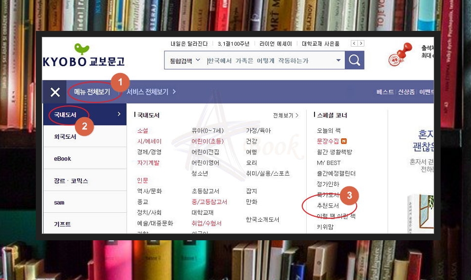 [교보문고 공식 홈페이지]에 접속하면 베스트셀러는 물론이고, 다양한 이벤트에 대한 정보가 많이 보이는데요. 홈페이지 좌측 상단에 있는 [메뉴 전체보기] 버튼을 클릭해 보세요. 그럼 국내도서, 외국도서, ebook 등 여러 카테고리가 나오는데요. [국내도서]를 클릭한 후 [스페셜 코너]에 있는 [추천도서]를 클릭해 보세요. 꼭 읽어야 할 책 리스트가 나와요.