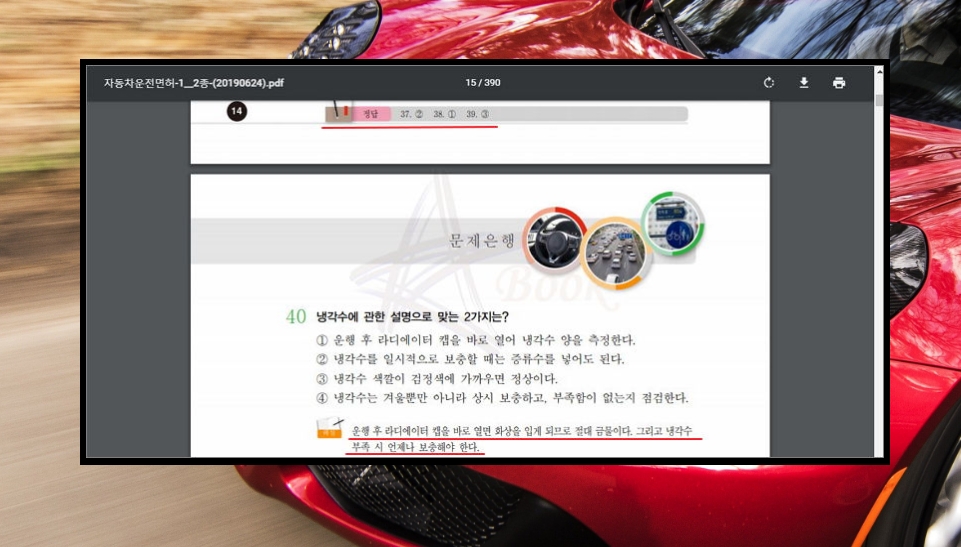 필요한 분들을 위해 문제은행 자료를 첨부했어요. 도로교통공단 사이트에서 받은 자료에요. 자료에 문제는 물론이고, 해설과 정답이 포함되어 있어요. 혼자서 독학하기에 충분해요. 해당 자료로 부족하다 싶으면 기본서 하나 더 보시는 것이 좋아요.