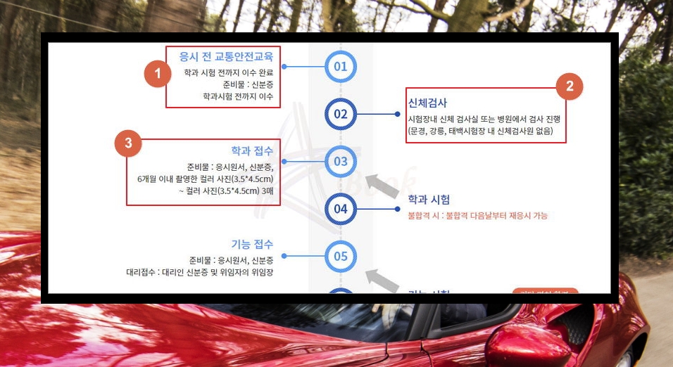 일단 진행 과정에 대해 설명 드릴게요. 운전면허 필기시험 접수를 하기 이전에 해야 할 일이 있어요. 교통안전교육을 이수해야 하고요. 신체검사를 받아야 해요. 신체 검사실이나 병원에서 검사를 받을 받을 수 있어요. 접수를 하려면 응시원서와 신분증, 컬러 사진을 준비해야 해요. 사진의 경우에는 6개월 이내 촬영한 컬러사진 3장을 준비하셔야 해요. 필기는 불합격을 한 다음날에 재응시가 가능해요. 응시 비용이 들기 때문에 가급적이면 한 번에 합격하는 것이 좋아요.