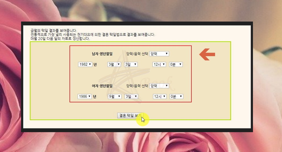 천기대요의 결혼 택일법을 이용하려면 신랑과 신부의 생년월일을 입력해야 해요. 태어난 시각까지 정확히 입력해 주세요.