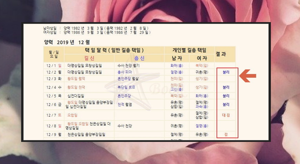 이런식으로 어느 날이 길한지 또는 흉한지 쉽게 알 수 있는데요. 이와 같은 서비스를 이용하면 날짜 잡는법은 어렵지 않습니다. 좋은 날 선택하셔서 행운이 가득하시길 바랍니다.