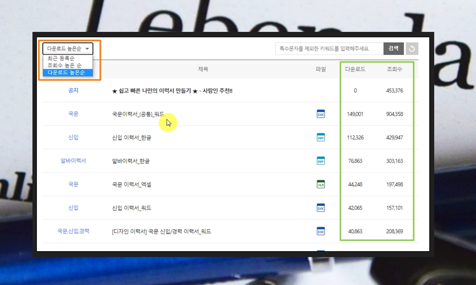 그럼 사람인에서 제공하는 이력서 양식을 몇 가지 살펴볼게요. 워낙 많다보니 어떤 것을 선택해야 할지 막막하실 수 있는데요. 그러한 경우에는 리스트 좌측 상단에 있는 정렬 기능을 이용해 보세요. 조회수나 다운로드 횟수가 높은 순으로 여러 가지 이력서 양식을 정렬할 수 있어요. 사람인 사이트에 방문한 사람들이 가장 많이 다운로드 받은 국문이력서(공통)를 선택해 볼게요.