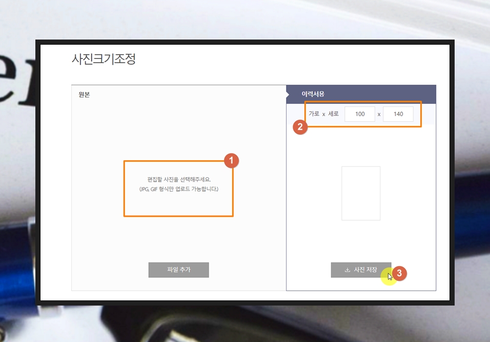이력서 양식을 보면 사진을 첨부하는 부분이 있는데요. 앞서 언급한 취업TOOL에 있는 사진 크기 조정 서비스를 활용하면 해당 양식에 딱 맞게 사진 조정을 할 수 있어요. 사용법은 간단해요. 편집할 사진을 업로드 한 후 가로, 세로 크기 수치 입력 후 "사진 저장" 버튼을 누르면 돼요.
