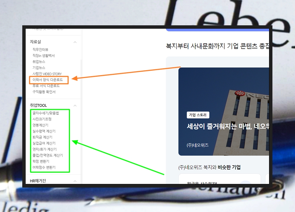 기업 연구소 페이지에서는 자료실과 취업 TOOL 서비스를 제공하고 있는데요. 자료실을 보면 우리가 이용하고자 하는 사람인 이력서 양식을 다운로드 받을 수 있는 페이지가 포함되어 있어요. 취업 TOOL은 이력서나 자기소개서를 작성할 때 유용하게 사용할 수 있는 TOOL을 의미하는데요. 글자수세기, 연봉계산기, 사진크기조절, 학점 변환기 등 쓸모 있는 것이 많아요.