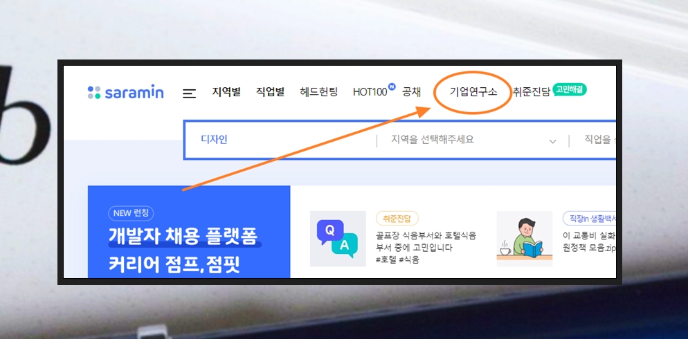 사람인 사이트에 접속했어요. 다양한 채용 정보를 지역별, 직업별로 찾아보거나 헤드헌팅이나 공채 정보 서비스 등을 이용할 수 있는데요. 메뉴에서 가장 오른쪽 두 번째를 보면 "기업연구소"가 있어요. 해당 메뉴를 클릭해 보세요.