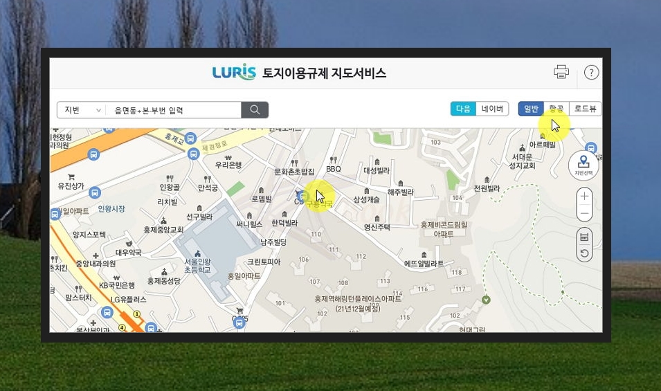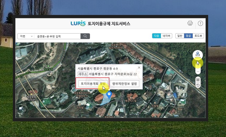 지도 서비스에서 [항공] 버튼을 클릭해 보세요. 그럼 하늘에서 촬영한 것과 같은 실물 지도가 나타나요. 이 상태에서 토지이용계획확인원 열람을 하고 싶다면 [지번 선택]을 클릭한 후 알아보고 싶은 위치를 클릭해 주세요.