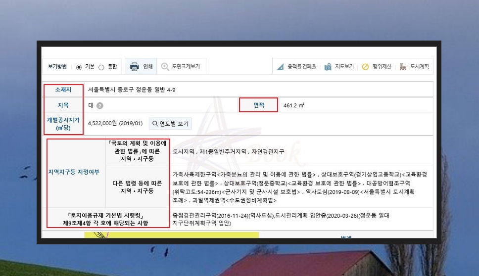 그 다음으로 나타나는 것은 확인도면인데요. 해당 도면을 통해 대공방어협조구역, 도시지역, 제1종 일반주거지역, 자연경관지구, 역사도심, 법정동, 도시관리계획 입안중 등 해당 토지에 대한 사항을 손쉽게 파악할 수 있어요.