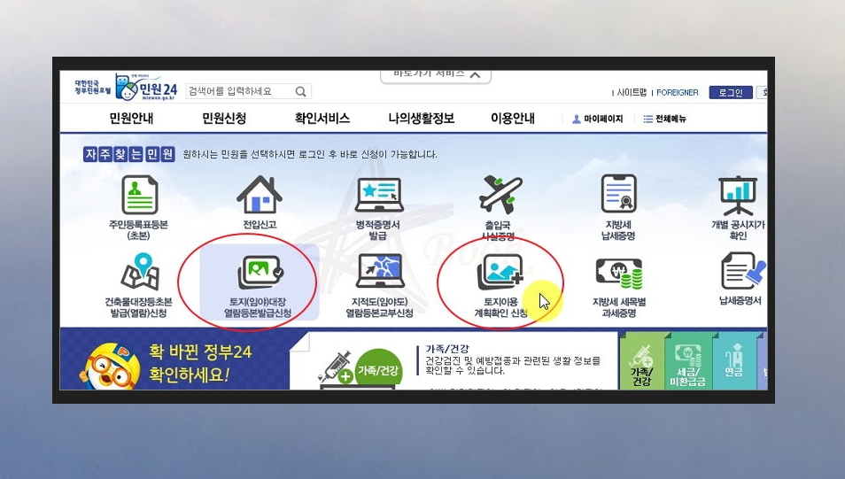 해당 문서를 발급 받을 수도 있는데요. 홈페이지 우측에 있는 민원24 버튼을 클릭하면 돼요.