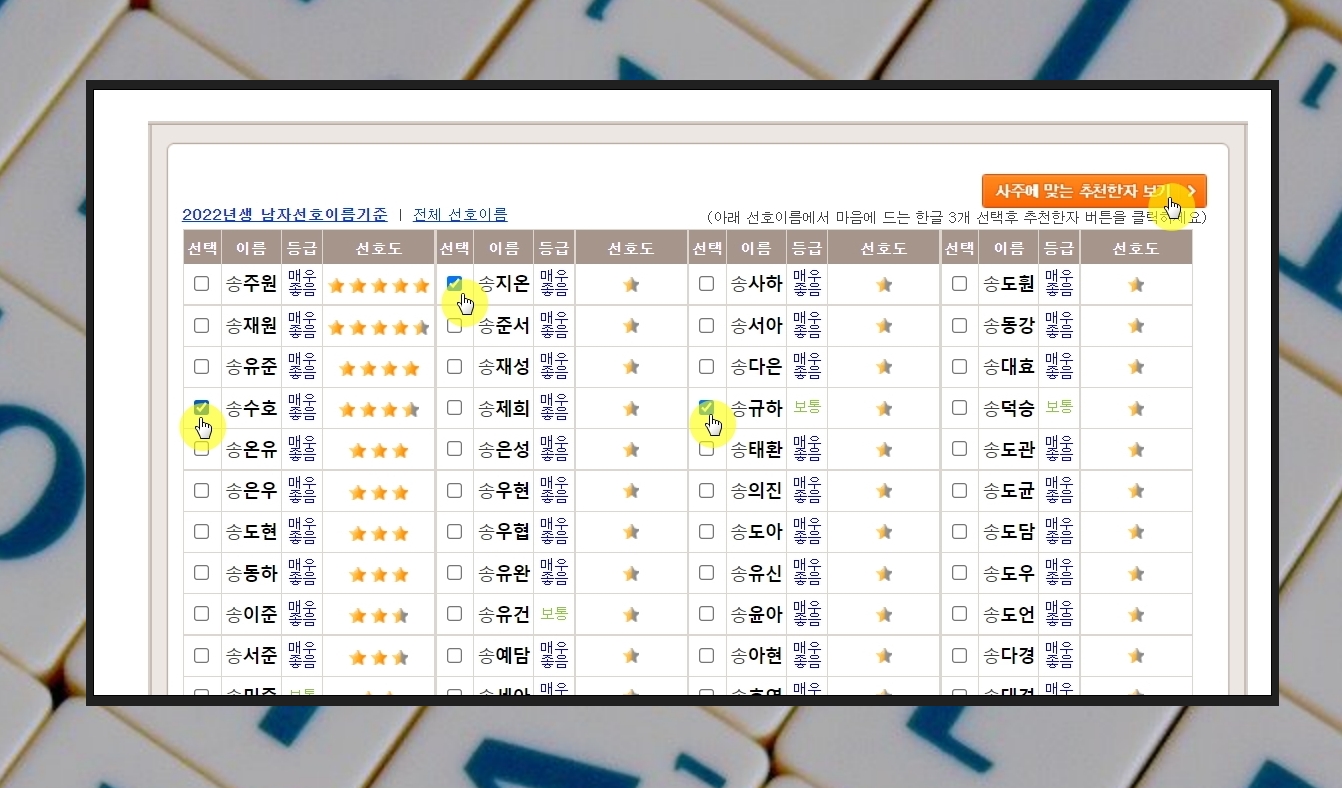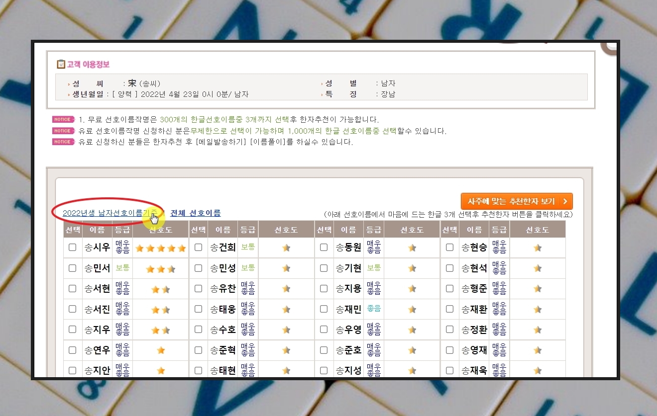 해당 사이트에서 마음에 드는 한글 이름 3가지를 선택합니다. 그 다음 [사주에 맞는 추천한자 보기] 버튼을 클릭하면 한자 이름 5개를 얻어낼 수 있습니다.