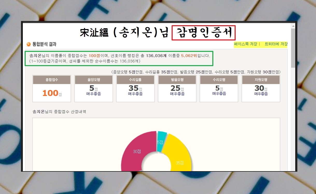 감명인증서를 받아보기 위해서는 사이트의 한자 추천 페이지에서 [이름 풀이] 버튼을 클릭하면 됩니다. 그럼 보기 좋게 전체적으로 정리한 작명 결과를 받아볼 수 있습니다. 종합점수나 선호도 랭킹, 성명학 점수를 확인할 수 있죠. 페이스북이나 트위터 사이트에 저장도 가능합니다.