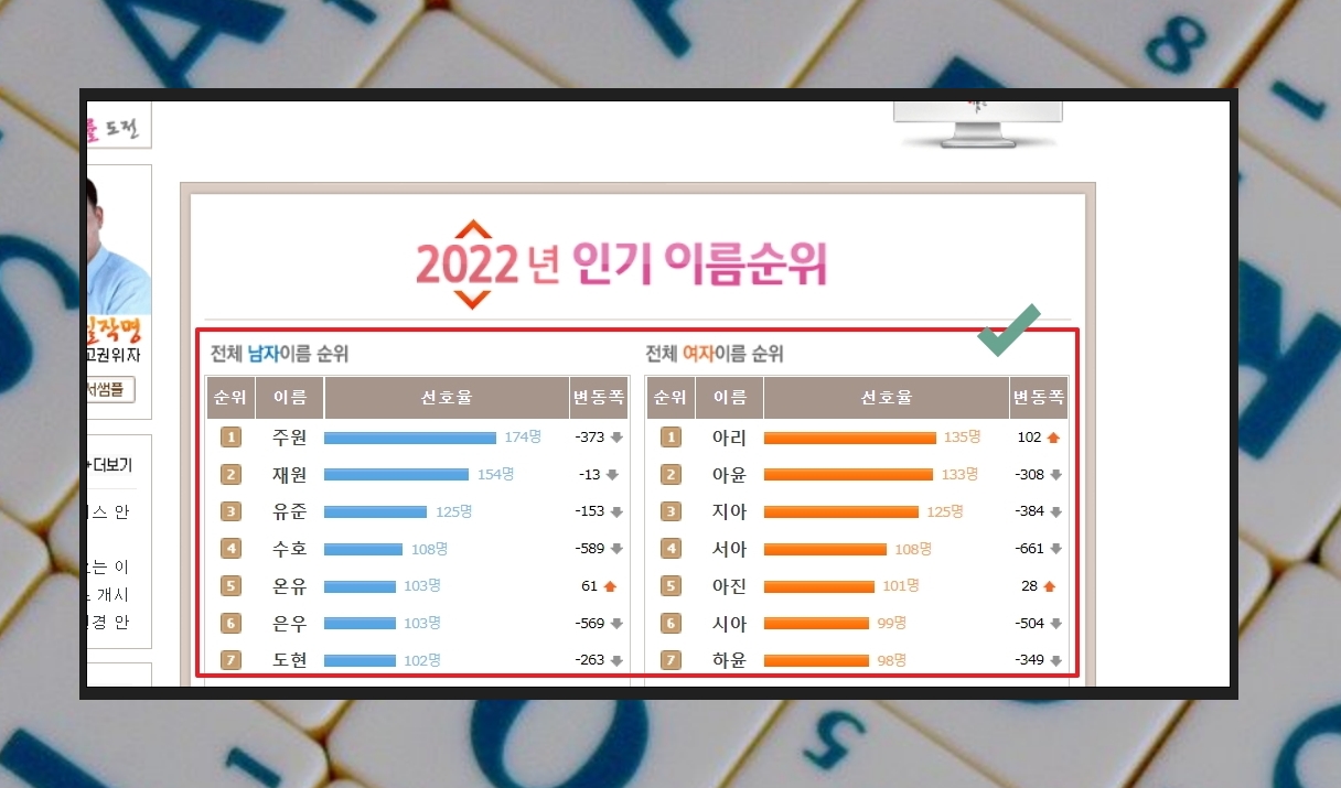 제가 이름짓기를 할 때 주로 이용하는 사이트에서는 다음과 같이 연도별 인기 이름순위를 알려줍니다. 남자의 경우에는 주원, 재원, 유준, 수호, 온유, 은우, 도현이 인기가 많고, 여자의 경우에는 아리, 아윤, 지아, 서아, 아진, 시아, 하윤이 1위에서 7위를 차지하고 있습니다. 계속 변동이 있지만, 그래도 유의미하게 볼만한 내용이라고 생각합니다.