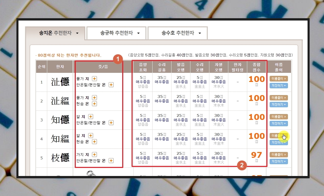 한자의 경우에는 뜻이 좋은 것은 물론이고, 성명학 이론에 속하는 음양조화, 자원오행, 수리오행, 발음오행, 수리길흉 부분에 있어서 좋은 평가를 받는 것들로 구성되어 있습니다. 제가 선택한 성명의 경우 종합점수가 100점인 한자가 4개나 나왔습니다. 이정도로 좋은 것은 극소수에 해당합니다. 이정도까지는 아니지만, 대부분 90점 이상으로 좋은 축에 속한 결과가 나옵니다.