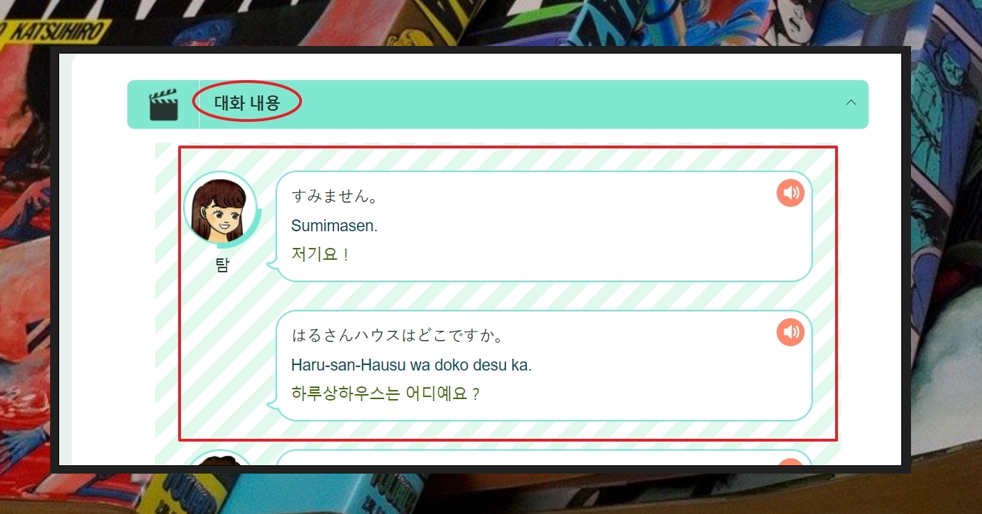동영상 컨텐츠 아래에는 여러 가지 부가 학습 컨텐츠가 있습니다. 대화 내용 스크립트를 통해 일본어, 영어, 한국어 대화 문장을 살펴볼 수 있습니다. 스피커 모양을 클릭하면 음성으로 듣기 가능합니다. 이러한 대화 내용을 많이 보면 히라가나에 익숙해 질 겁니다.