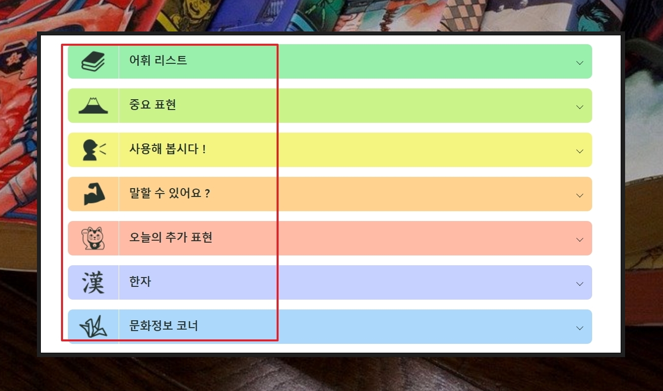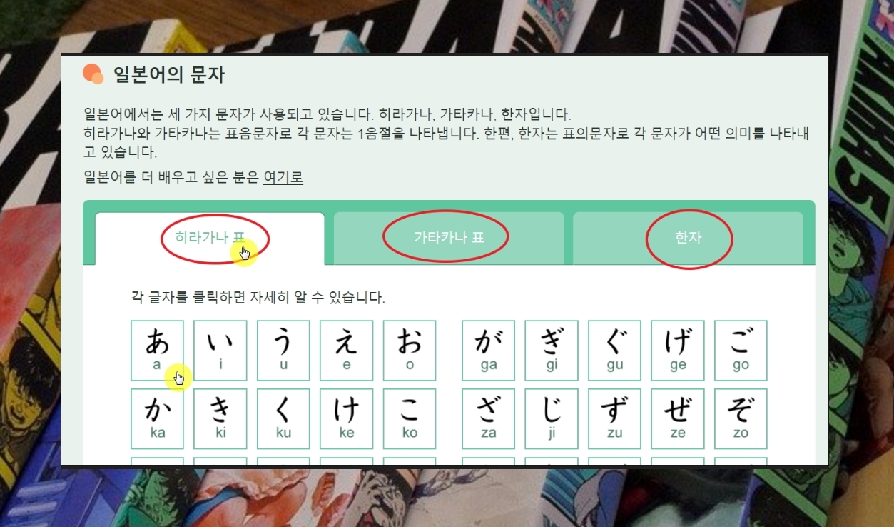 일본어 학습에 가장 기본이 되는 히라가나, 가타카나, 한자에 대한 표를 이용해 보았습니다. 여기에 더하여 회화 공부를 할 수 있는 학습 컨텐츠를 잘 활용하면 실력 향상에 많은 도움이 될 겁니다.