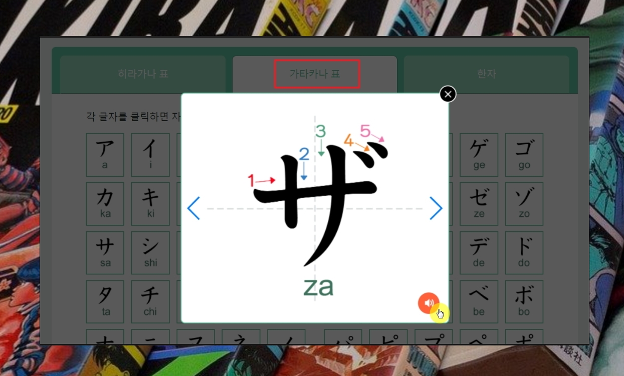 화면에서 문자를 클릭하면 이렇게 큰 화면으로 문자를 볼 수 있습니다. 획순이 적혀 있기 때문에 어떤 순서대로 문자를 쓰면 되는지 알 수 있습니다. 우측 하단에는 스피커 모양의 아이콘이 있는데, 해당 아이콘을 클릭하면 해당 문자를 발음하는 음성을 들을 수 있습니다.