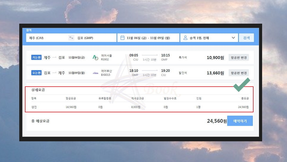 마음에 드는 항공권을 클릭하면 예매를 진행할 수 있습니다. 예매 진행에 앞서 제주에서 가는날과 출발시간, 김포에서 돌아오는 날 출발시간을 꼼꼼히 확인하시길 바랍니다.