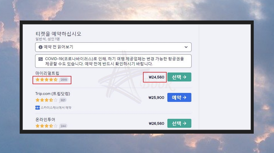 티켓 예약은 항공사나 여행사 사이트에서 진행할 수 있습니다. 스카이스캐너에서 제시한 업체 중 하나를 선택하면 됩니다. 최저가 항공권을 원하신다면 가장 저렴한 가격을 제시한 업체를 선택하면 됩니다.