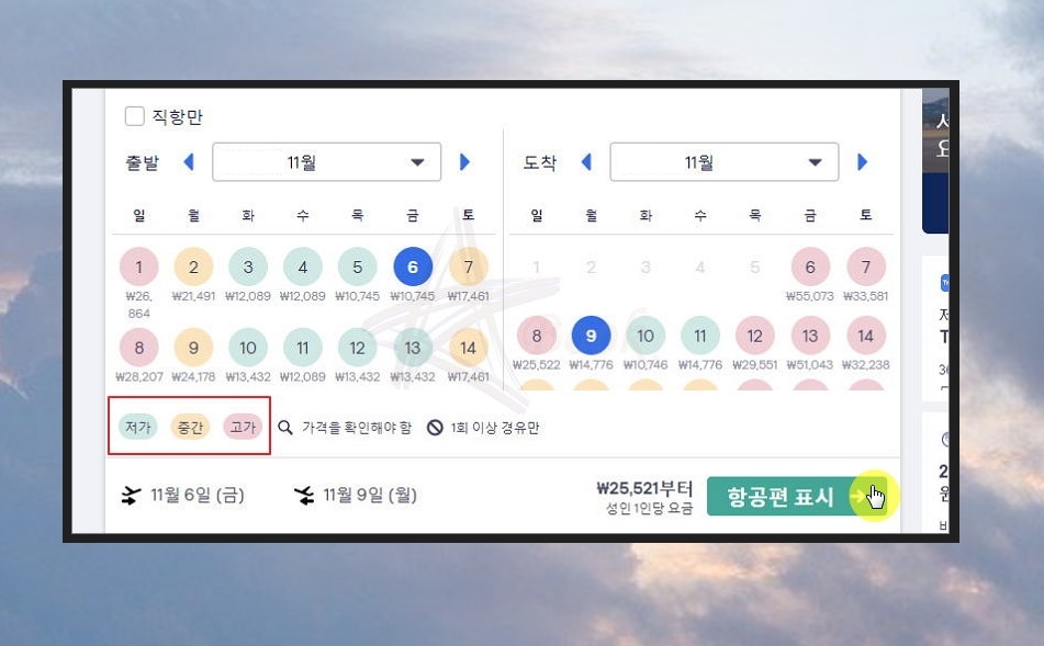마지막으로 비행기 탑승 시간을 정해야 합니다. 단순히 김포나 제주에 도착하기만 하면 되는 것이라면 최저가 항공편을 선택하면 됩니다. 여행 목적으로 하는 경우라면 이야기가 다릅니다. 낮에 도착하고, 돌아올 때에는 오후나 저녁에 돌아오는 것이 좋습니다. 여행 스케쥴을 감안하여 적당한 시간대를 선택하시길 바랍니다. 좌측에 있는 출발 시간 설정 기능을 이용하면 조건을 충족한 최저가 항공권을 쉽게 찾을 수 있습니다.